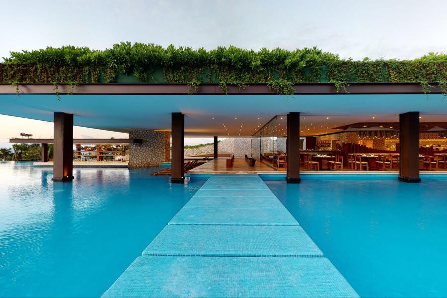 An open-air poolside restaurant serving a mix of Mediterranean and Mexican dishes.