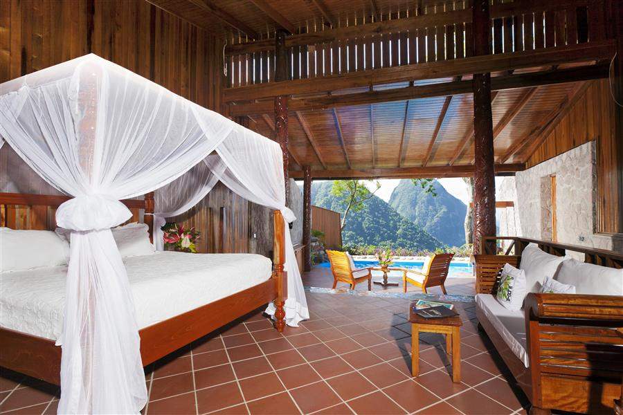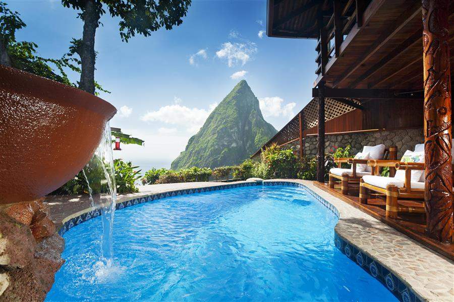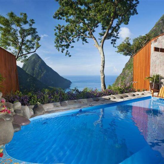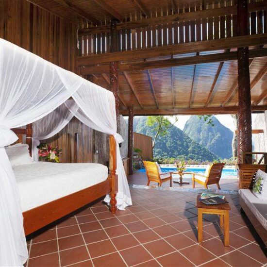 Located over a thousand feet above the Caribbean Sea with the Piton Mountains as a spectacular backdrop,  Ladera in Saint Lucia is a stunning four star plus resort providing a luxurious tree-house experience for guests aged 18 years and older. Once part of the Rabot Estate in Soufriere, Ladera is a unique boutique resort featuring private, open wall suites with private plunge pools and uninterrupted views. Guests can enjoy a range of luxury facilities including a fine dining restaurant, a sumptuous spa and a main swimming pool. A shuttle service takes guests down to Sugar Beach where snorkelling and scuba diving can be easily arranged and the superb location means guests can enjoy a myriad of activities from hiking to sailing trips.
