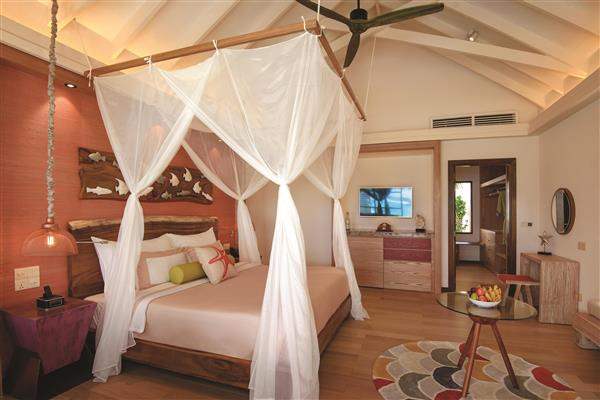 Beachfront Bliss! The tropical and vibrant stand-alone villas face the turquoise lagoons of Sangeli Island. Each have direct beach access and large open-air bathrooms. These villas sleep two adults and two children or three adults and one child.