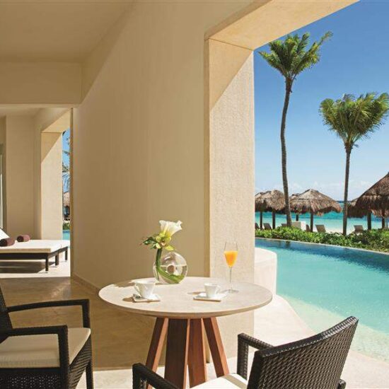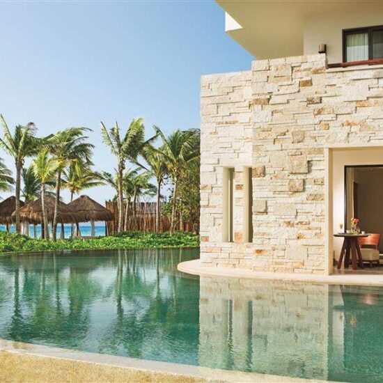 Secrets Akumal Riviera Maya is an adults-only resort set along the beautiful white sand beaches of Akumal in the heart of the Riviera Maya. The calm waters are ideal for swimming and snorkelling and guests can do diving along the Mesoamerican Barrier Reef. This all-suite resort offers an Unlimited-Luxury® experience that includes gourmet restaurants and oceanfront bars, endless daytime activities and live evening entertainment. There are three large swimming pools in the resort, along with 11 small pools that connect the swim-out suites. The resort is a short drive from vibrant Playa del Carmen and historic Tulum on the Yucatan Peninsula.
