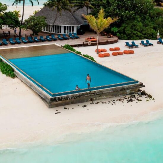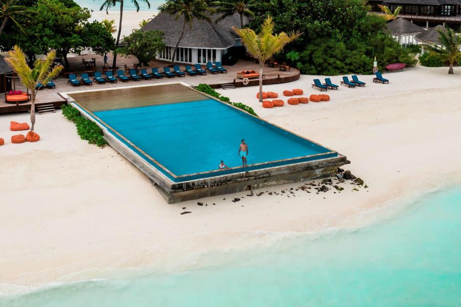 Guests can now stay in two brand-new room categories at the resort: Beach Pavilions and Sunset Beach Pavilions. Boasting beautiful positions on either side of the island (Beach Pavilions face the sunrise while Sunset Beach Pavilions face the setting sun), each accommodation type offers direct access to a shared swimming pool complete with a swim-up bar. The shared swimming pool for Beach Pavilions measures at 135 metres in length, while the shared pool for Sunset Beach Pavilions stretches for 210 metres, making it the longest swimming pool across the Maldives. Furthermore, the resort has undergone meticulous refurbishments, its sleek new aesthetic boasting an open-plan concept that sees the indoors and outdoors meld seamlessly with one another.