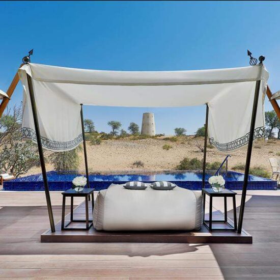 Stay at The Ritz-Carlton Ras Al Khaimah, Al Wadi Desert for a Bedouin-style experience among rolling sand dunes and a nature reserve in Wadi Khadeeja. This secluded desert oasis is an all-villa property each with a private swimming pool looking out over the dunes. Sit on your furnished terrace and watch Arabian oryx and desert gazelle walk by or sip cocktails under the stars at the rooftop lounge. Outdoor types will love the wide range of activities on offer from complimentary bike hire to falconry shows and nature walks. Opt for the ‘Rainforest’ treatment at the spa, a one-of-a-kind experience or dine on the dunes with a customised picnic.